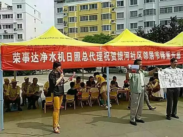 據悉,為了居民們在炎熱的夏日感受到一絲清涼,榮事達凈水機山東日照代理商和公司工作人員為居民們現場搭建帳篷,并且將凈水機搬到了活動現場,方便大家在參加活動的時候喝到免費安全的健康水?,F制現飲的純凈水受到了居民們的一致好評。
